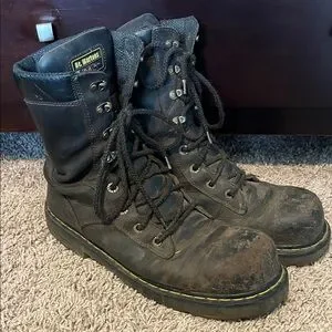 Well-worn and rugged brown leather boots with iconic yellow stitching. Dark brown leather. Comfortable and durable design.