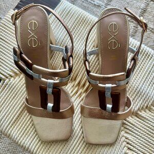 Stunning Exé genuine leather sandals made in Portugal, known for their exceptional craftsmanship and comfort. These luxury heels feature a chic mix of bronze, silver, and taupe metallic tones, a square toe, and geometric strap detailing that makes them both modern and timeless.