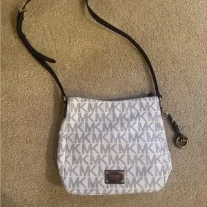 Elegant Michael Kors crossbody with signature monogram. Features a sleek white and blue design. Ideal for everyday use.