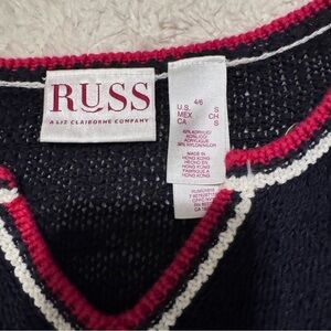 Vintage Russ sweater vest in black with a V-neck and red, white, and black striped trim. This preppy piece is in great vintage condition. It's a size small, perfect for a fitted look or to layer over a button-up shirt. The aesthetic is perfect for Y2K, academia, and cottagecore styles.