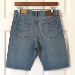 These jean shorts have a medium indigo wash with a raw tattered hem. They feature a zipper and button closure, belt loops, and double pockets on the front and back. They have a brand patch on the back right hip and a small brand tag on the front right pocket. They are comfortable with a classic slim fit. Pair with graphic tees and sneakers for a simple look! High quality, made to last! Great for Spring, Summer, and warm weather!