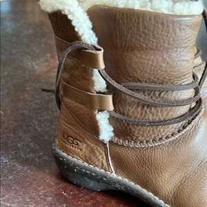 UGG leather boots with soft cream shearling. Ideal for winter warmth.