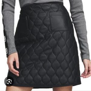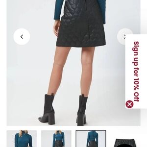 Mid length, quilted style. Zip closure at center back. Front patch pockets. Self binding at waistband and hem for clean finish. Back darts for a contoured fit. Material: 100% Polyester; 100% PU faux leather. Fully lined. Machine wash. US size S. Measurements: 19 3/4" from waist to hem, size S.