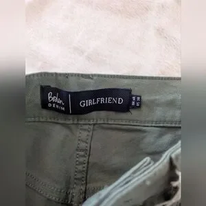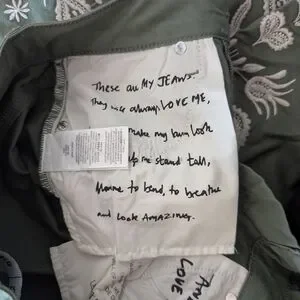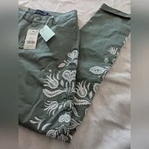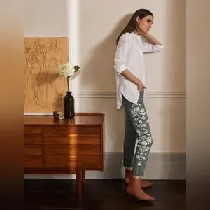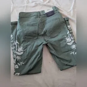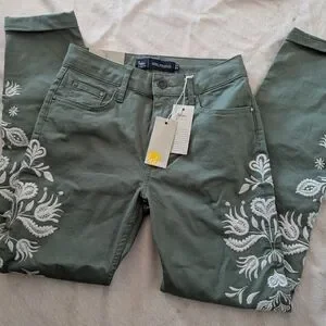 These jeans have a beautiful white floral embroidery on olive green (or khaki) fabric, with a slim/straight fit—perfect for a boho-chic or casual elegant vibe.