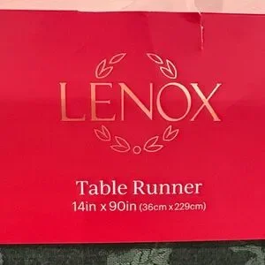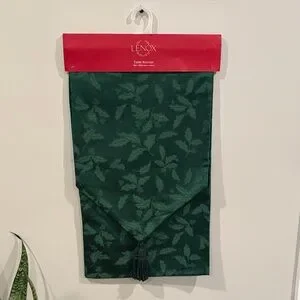 Luxurious Lenox table runner in forest green. Adorned with a festive holly leaf design. Ideal for enhancing your dining decor.l especially during the holidays. New in package