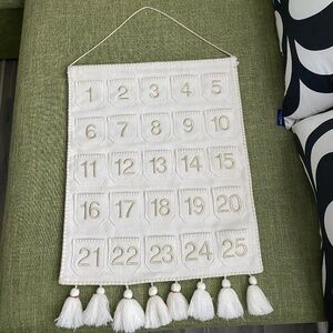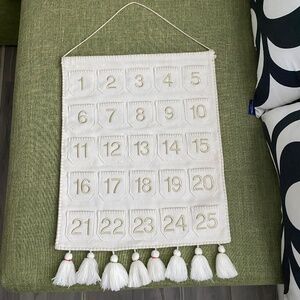 Gorgeous advent calendar from the Opalhouse collection. Cream color with gold threading on the numbers. Perfect for an elegant holiday. Add your own ornament to the slot as a daily marker. Smoke free home.