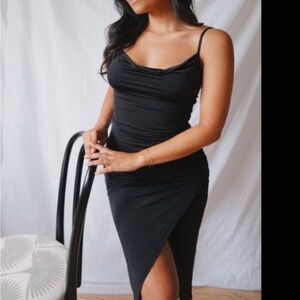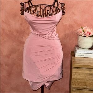Chic pink mini dress with draped design. Perfect for stylish outings.