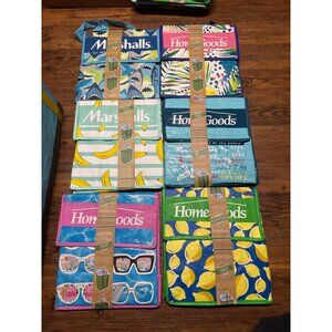 Set of 3 reusable HomeGoods-Marshalls insulated bags, perfect for keeping items hot or cold. Features durable zippered handles for easy carrying, collapsible design for convenient storage, and a variety of fun, colorful prints. Made from sturdy recycled materials. Dimensions: Height 12.5", Width 13.5", Depth 7.5". Condition: New with tags. Items pictured are the ones you will receive.