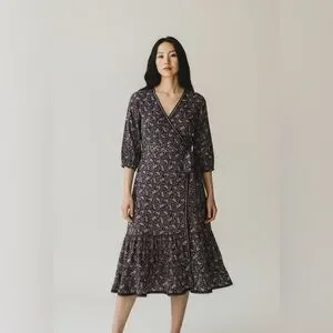 Elegant wrap midi dress with floral design. Features three-quarter sleeves and ruffled hem. Perfect for any occasion.