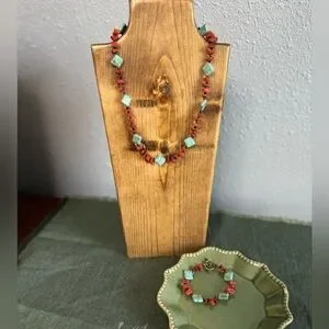 Handmade Red Coral and Turquoise Stone Beaded Necklace and Bracelet Set