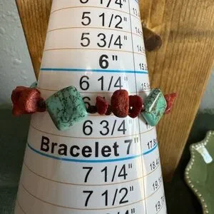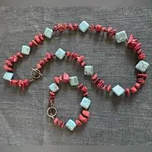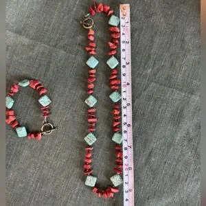 Elegant raw, red coral chips accented with turquoise colored stones and antique European seed beads. Rustic meets luxury! Perfect for adding a pop of color to any outfit. This necklace and bracelet set is handmade by me using quality natural elements and findings! The turquoise tests stone, but unsure what type of rock, if dyed or not? Brass-tone toggle closures on both pieces.