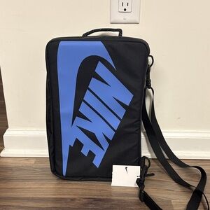 Sleek Nike duffel bag. Bold blue logo on black. Ideal for travel or gym.