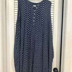 Chic navy dress with white geometric pattern. Sleeveless design. Ideal for versatile styling.
