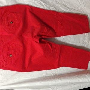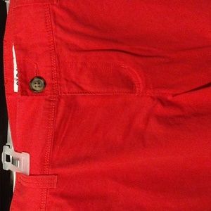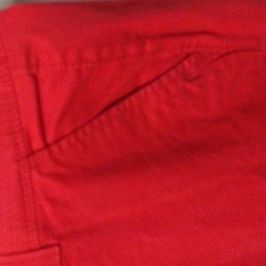 Old Navy, business casual but can carry over to night elegants, women's straight leg cotton pants in red. zipper and one button closure, front has two pockets with one small slit pocket, belted waist, two button pockets in back, size 14, worn, good condition, no discoloration, no rips or tears, straight leg measuring from the waist down 34 in, from center of leg down 25 in, smoke-free home and pet-free home