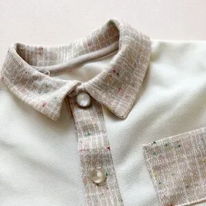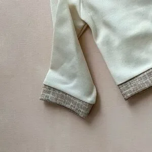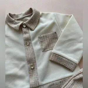 An adorable 2 piece baby set. A collared button front top, cream with tan & speckle trim, including a breast pocket. The matching pants made from the speckled trim fabric have an elastic waist.