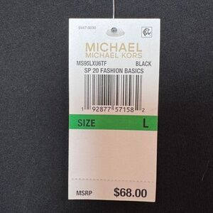 New with tags - Michael Kors short-sleeve top with a tiered, ruffled hem. The top part is a solid fabric, while the bottom features a double or tiered hem made of a sheer, chiffon-like material. Size large. Measures approximately 29" from shoulder to hem and 18" pit to pit.