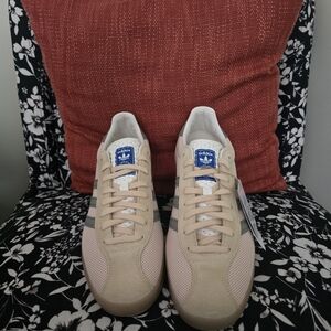 Stylish Adidas Gazelle sneakers in cream color with a striking blue logo. Perfect for casual wear.