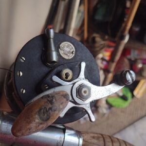 Explore the classic charm of this vintage fishing reel, featuring a sleek black finish and a sturdy wooden handle. Perfect for fishing enthusiasts who appreciate timeless design.