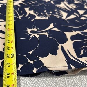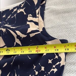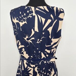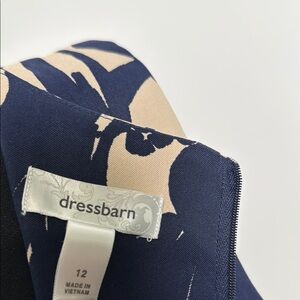 This stunning sleeveless A-line dress from Dress Barn features a sophisticated navy blue and cream floral pattern. Perfect for a wedding guest or cocktail event, the crew neck design and structured fabric offer a flattering silhouette that falls gracefully to a midi length.