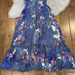 JAASE Maxi Dress in Very Good Condition. It had a Smocked Waist and is Blue Floral. It is a Size Large. It measures approximately 19.5 from armpit to armpit and 52 from shoulder to hem. Any questions, please ask!