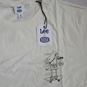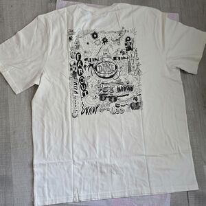 Cream tee featuring a unique skateboard graphic. Casual and trendy style.