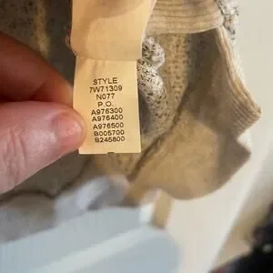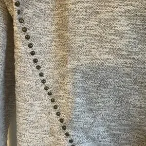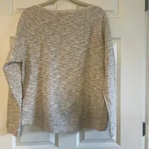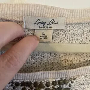 Lucky Lotus Sweater Beige metallic Knit Pullover Embellished Studded Ladies Sz L. The mixed thread textured knit and beaded accents add a touch of bohemian flair to this classic pullover style. The boat neck and raglan sleeves give it a relaxed fit that's perfect for the holiday season or outdoor adventures. Crafted from a breathable cotton polyester metallic blend, this sweater is both stretchy and machine washable for easy care. The solid beige color complements any outfit and the straight hemline makes it easy to pair with your favorite pants or skirt.
