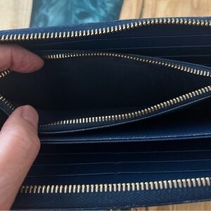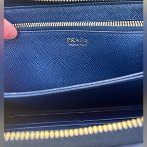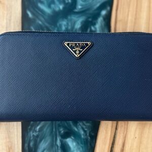 Prada Saffiano leather blue zip-around wallet.