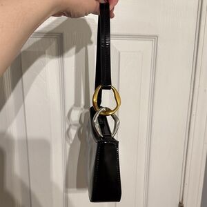 Excellent condition, worn twice. Bag is made out of polished leather and has two-tone hardware design on the strap and a zip closure. Comes with dust bag.