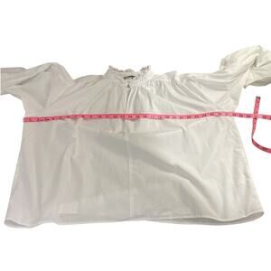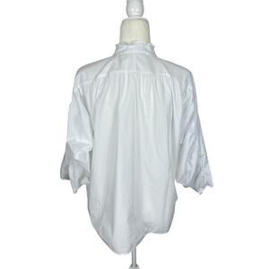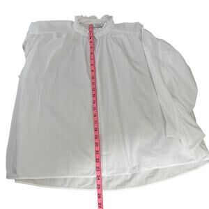 100% cotton poet blouse. Ruffled collar with button closure. Pleating to front and back for a flowy romantic feel. Puffy sleeves with mini pleats. White. Size XS. This item is oversized. Please see photos for measurements.
