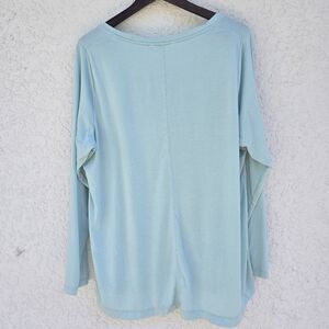 This long-sleeve scoop neck top is designed for active wear, such as workouts, gym, and yoga. The shirt has a relaxed fit and is made from a soft fabric, often a blend that includes Modal and recycled polyester, with ionic+™ technology to eliminate odor.