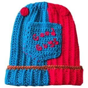 chucky inspired, crochet beanie, handmade, unisex, teen accessory, halloween costume, horror cosplay, 90s retro, nostalgic, colorful pattern