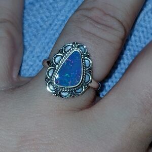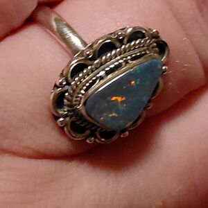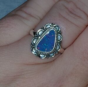 This elegant silver ring features a stunning opal centerpiece. The opal's vibrant colors make it a standout piece for any jewelry collection.
