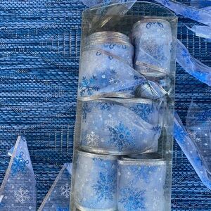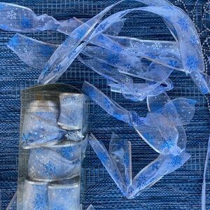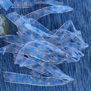 Beautiful tree topper bow with 3 foot streamers made with glittered blue and silver snowflake patterned ribbon. The ribbon is white sheer with silver wired edging.