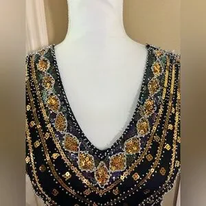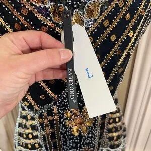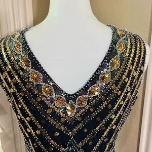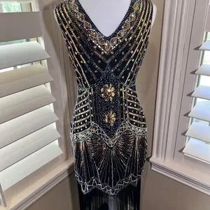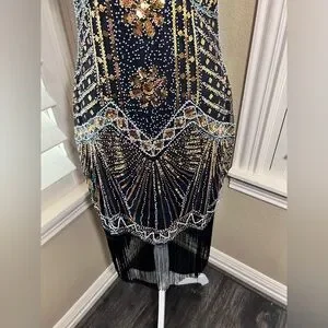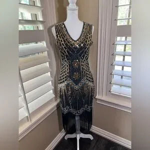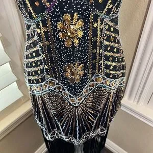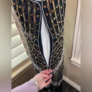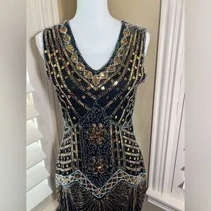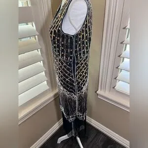 Turn heads with this chic black and gold mini dress. The intricate beadwork adds a touch of luxury, making it perfect for any special occasion.
