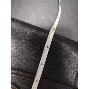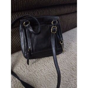 Gorgeous black leather bag has a fold over locking closure, an adjustable strap, an outside organizational pouch, and an inside zipper pouch. Mild spotting - see photos.