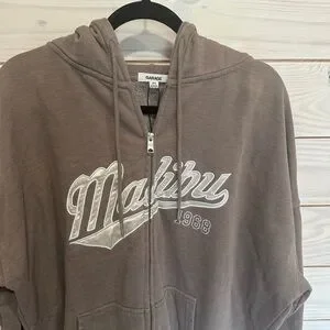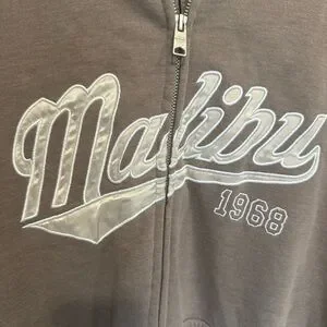 Cozy brown hoodie with 'Malibu 1968' graphic. Perfect for casual wear.