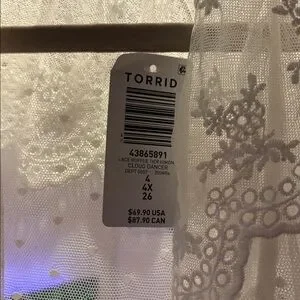 Never worn!! Was going to use for my wedding but I changed mind. Out of my return window for torrid. About 57 inches in length!