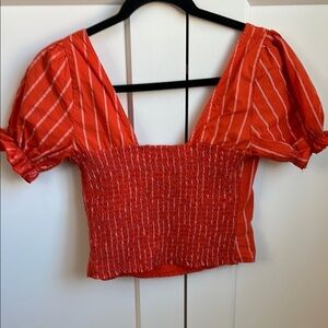 Stylish orange striped top with puff sleeves. Perfect for any occasion.