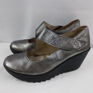 Fly London Gunmetal Gray Pewter Yasi Wedge Mary Jane Style Shoes 40 US 9 9.5.