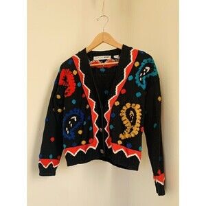 Chaus Petite Bright Bold Paisley Cropped Cardigan Black Sweater Women’s Sz XS