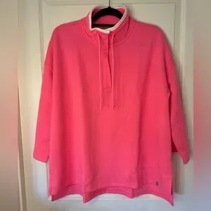 Our oh-so-cozy mockneck pullover in an eye-catching mixed direction texture. Detailed with a half-button placket for versatile styling. Features functional drawstrings at the neck, breezy three-quarter sleeves, and contrast trim.