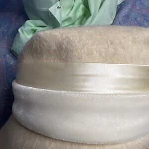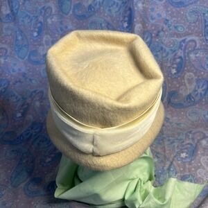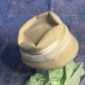 This elegant women's hat dates to the 1950s and features a classic cream color, likely made from a wool blend. It is accented with off-white/ white bands that enhance its timeless style. The overall condition of the hat is excellent, with no major flaws noted to the structure or fabric.