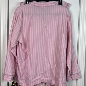 2 Pc. Pajama set, long sleeved button down top size large. Pinks striped, pocket. Bust 23”. Long pants, elastic waistband with drawstring. Waist 17”, inseam 29”. In good condition. Teresa3