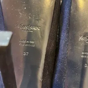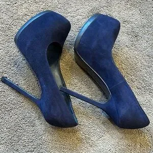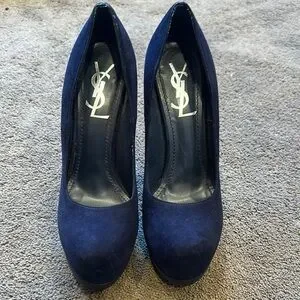 These Yves Saint Laurent heels feature a stunning deep blue hue crafted from a luxurious suede-like material. The classic pump design is complemented by a sleek pointed toe and a high stiletto heel, offering both elegance and sophistication.