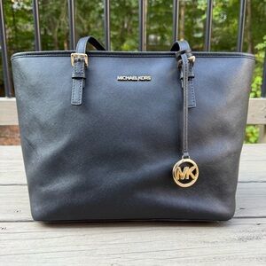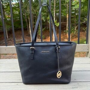 Michael Kors Jet Set Black Saffiano Leather Top Zip Tote Bag Purse
