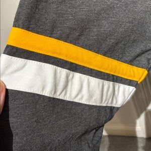 Support the Steelers with this Grey Long sleeve Shirt. Features The Steelers team logo across the chest in their signature colors & Yellow and white stripes around the around. Ideal for fans.