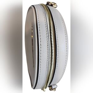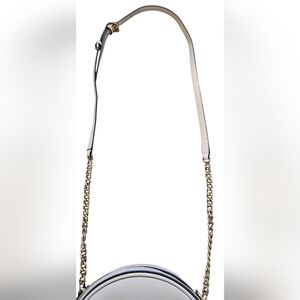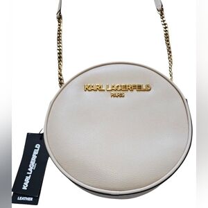 New with tags! Elevate your style with the Karl Lagerfeld Paris Maybelle Round Crossbody Bag. This chic accessory features a sleek design and a versatile shell color, perfect for any occasion. The gold chain strap adds a touch of elegance. The gold hardware chain strap is adjustable, and the bag is made out of leather. One slit pocket on the exterior, 2 pockets interior, and 2 card holders inside. Color may vary due to camera lighting.