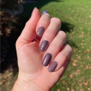 New in package Color Street nail strips. Exclusive “Go With the Workflow” is a taupe shimmer with a pink and purple herringbone pattern. This shade was part of the September 2024 Color Play box, Dress Code.