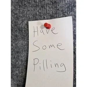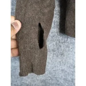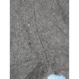 Condition notes: Multiple small holes on the body and a larger tear at a sleeve cuff; pilling present. Please review all photos for exact locations of damage.