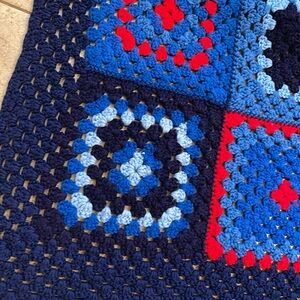 Vibrant crochet blanket with red, blue, and navy squares.